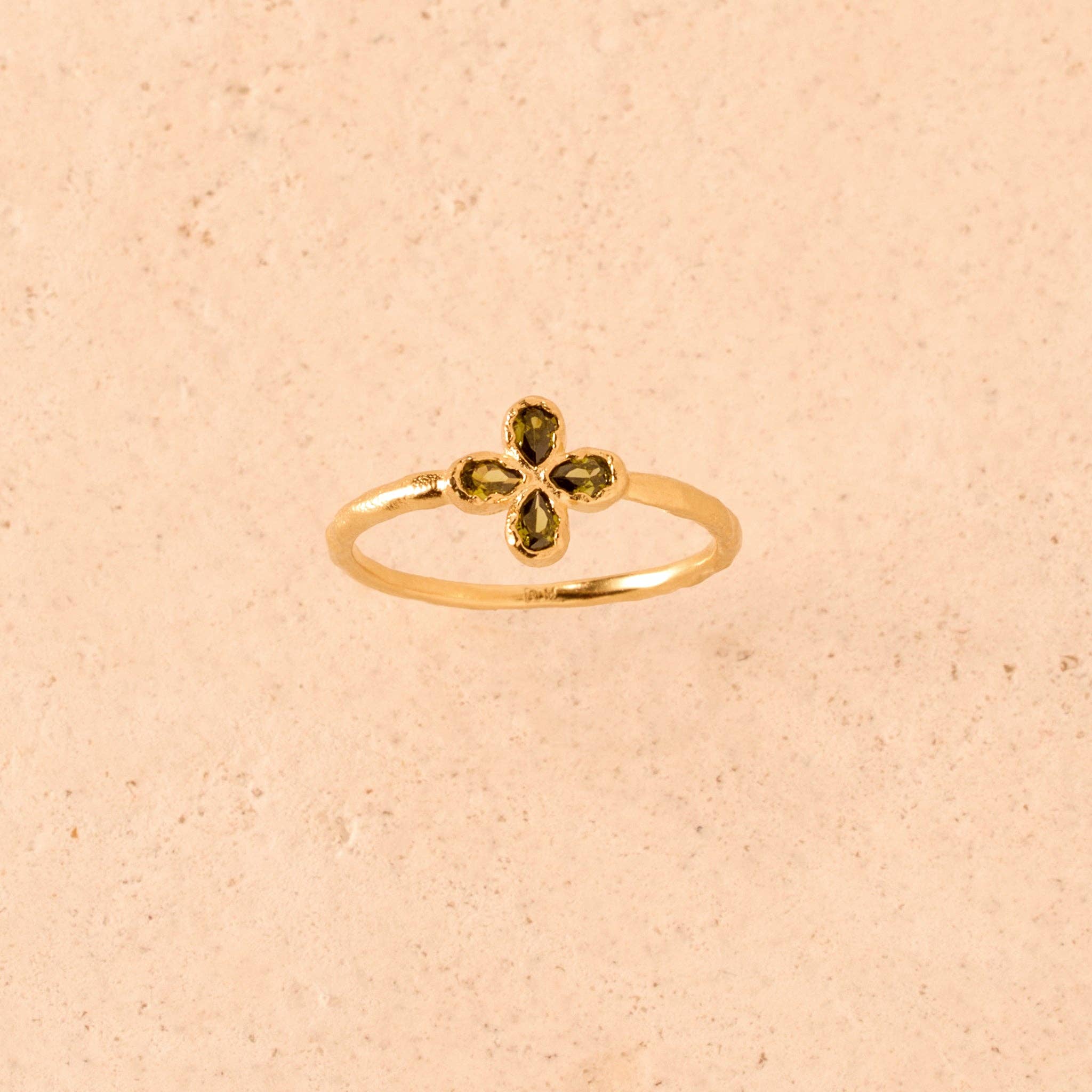 a thin four-leaf clover ring hand-set in gold, with a textured band and an irregular finish.