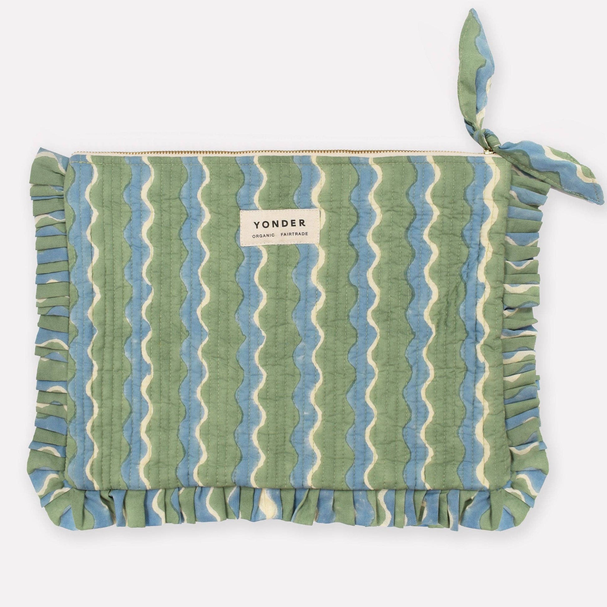 hand block-printed on soft, organic cotton using eco-friendly, AZO-free dyes, it’s designed to fit a laptop, hold your makeup essentials, or carry your travel necessities with ease.